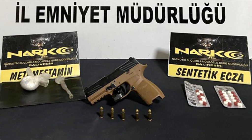 Balıkesir'in Atatürk Mahallesi Turgut Reis Caddesi'nde bulunan Devlet Hastanesi civarında şüphelendikleri aracı durduran ekipler, araçtaki iki kişinin üst aramasında, E.C. isimli şahsın üzerinden ruhsatsız silah ile 19,74 gram metamfetamin ele geçirdi. Araçtaki bulunan S.A.'nın üzerinde ise 15 adet 300 gramlık sentetik ecza bulundu. E.C. isimli şüpheliye 6136 sayılı Kanun'a muhalefet suçundan işlem yapılırken, şahıslar İl Emniyet Müdürlüğü Narkotik Büro'ya teslim edildi.