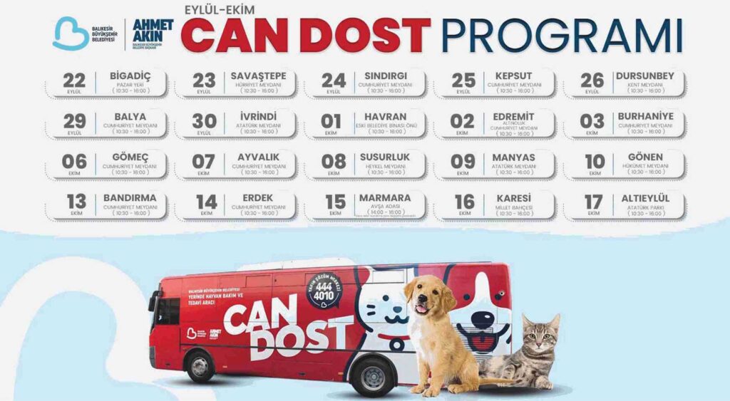 Adım adım bütün ilçeleri gezen Can Dost Mobil Hayvan Bakım ve Tedavi Aracı Bigadiç Pazar Yerinde başlayacağı serüvenine Savaştepe Hürriyet Meydanı, sonrasında Sındırgı Cumhuriyet Meydanı ile devam edecek. Ardından 25 Eylül Kepsut Cumhuriyet Meydanı, 26 Eylül Dursunbey Kent Meydanı, 29 Eylül Balya Cumhuriyet Meydanı, 30 Eylül İvrindi Atatürk Meydanı’nda can dostlar ile buluşacak. 1 Ekim Havran Eski Belediye Binası Önü, 2 Ekim Edremit- Altınoluk Cumhuriyet Meydanı, 3 Ekim Burhaniye Cumhuriyet Meydanı, 6 Ekim Gömeç Cumhuriyet Meydanı, 7 Ekim Ayvalık Cumhuriyet Meydanı, 8 Ekim Susurluk Heykel Meydanı, 9 Ekim Manyas Atatürk Meydanı, 10 Ekim Gönen Hükümet Meydanı, 13 Ekim Bandırma Cumhuriyet Meydanı, 14 Ekim Erdek Cumhuriyet Meydanı, 15 Ekim Marmara- Avşa Adası şeklinde programına devam edecek olan Can Dost Mobil Hayvan Bakım ve Tedavi Aracı, 16 Ekim Karesi Millet Bahçesi, 17 Ekim Altıeylül Atatürk Parkı ile hizmetine son verecek.