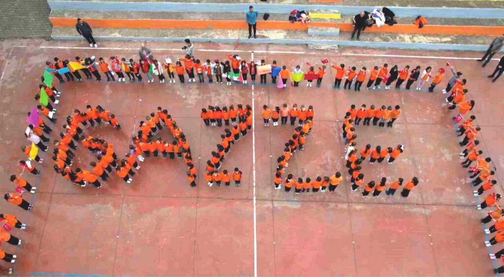 Okul bahçesinde toplanan yüzlerce öğrenci, öğretmenlerinin rehberliğinde Türk ve Filistin bayraklarını ellerine alarak “Gazze” kareografisi oluşturdu. Etkinlik, dronla havadan görüntülendi. Etkinlikte öğrenciler, Gazze’deki çocukların yaşadığı zorluklara dikkat çekmek için barış ve dayanışma mesajları verdi.