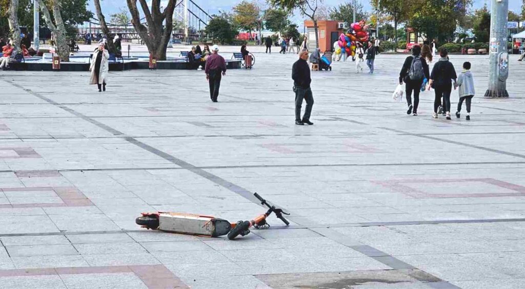 Kent genelinde e-scooterların en büyük sorunlarından biri ise park alanları. Kullanım sonrası gelişigüzel bırakılan scooterlar, çoğu zaman kaldırım ortasında, bina girişlerinde ya da çöp konteynerlerine kilitlenmiş halde görülüyor. Bu durum hem çevre hem de görüntü kirliliği oluşturuyor; aynı zamanda vatandaşların kaldırımlarda rahat yürüyememesine neden oluyor.