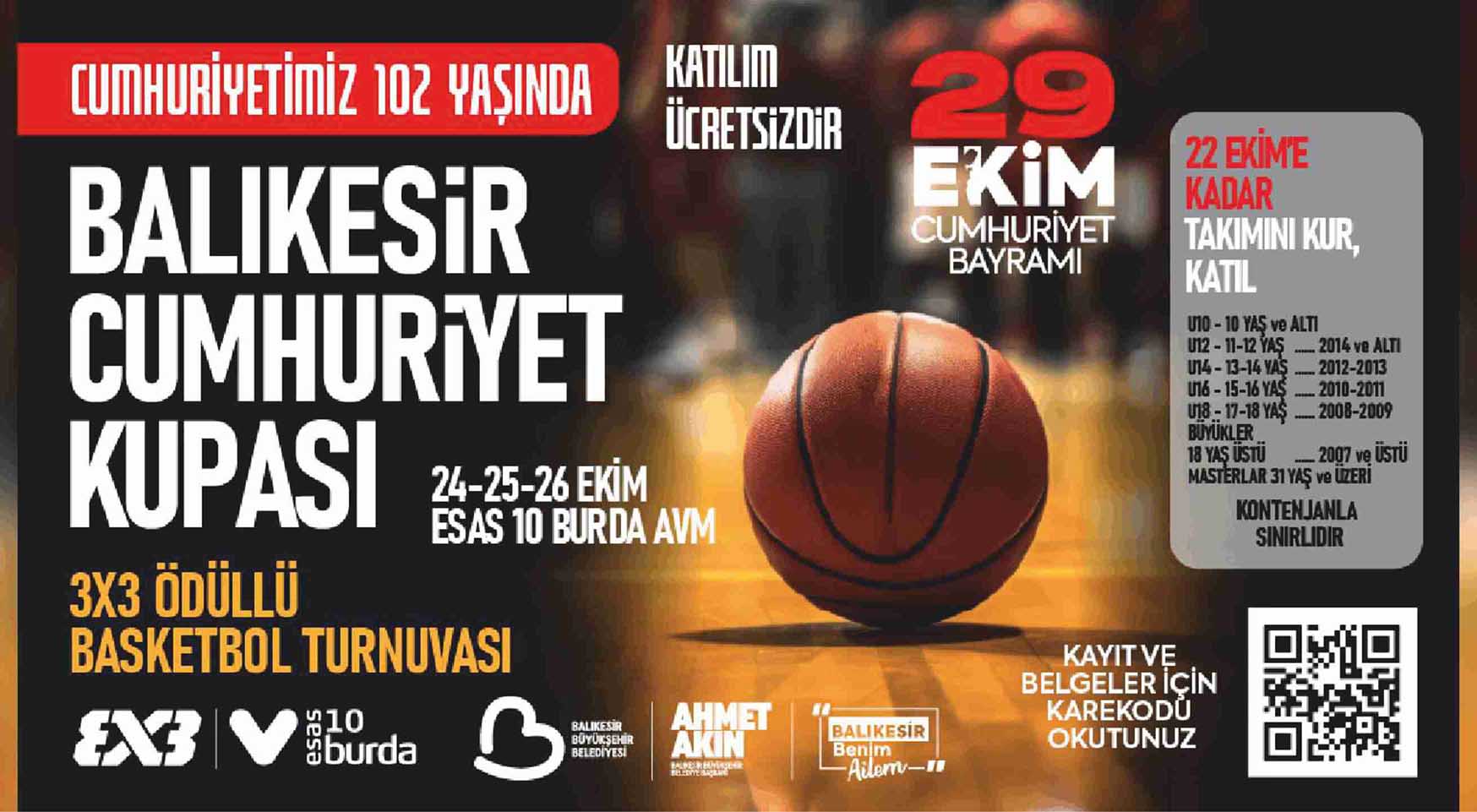 Balıkesir Büyükşehir Belediye Başkanı Ahmet Akın, Cumhuriyet Bayramı Haftası kapsamında gerçekleştirilecek olan etkinliklerle basketbolseverlerin de gönlünde taht kuruyor. Etkinlikler kapsamında 3 gün boyunca devam edecek 3×3 basketbol turnuvasında dereceye giren sporculara ödüller verilecek.