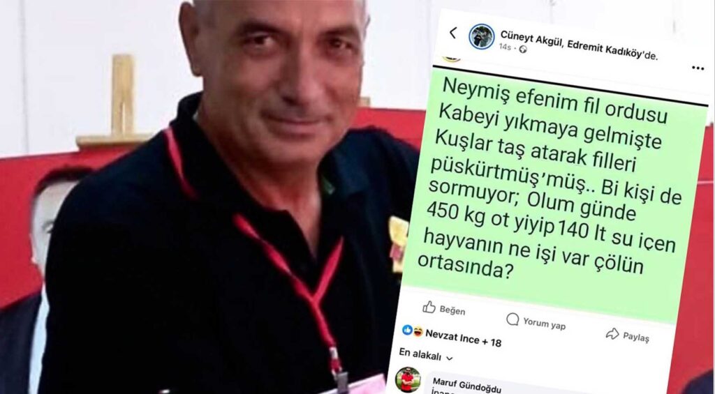 Cumhuriyet Halk Partisi (CHP) Edremit Kadıköy Mahalle Sorumlusu Cüneyt Akgül, sosyal medyada Fil Suresi’ne yönelik alaycı paylaşımı nedeniyle görevden uzaklaştırıldı.