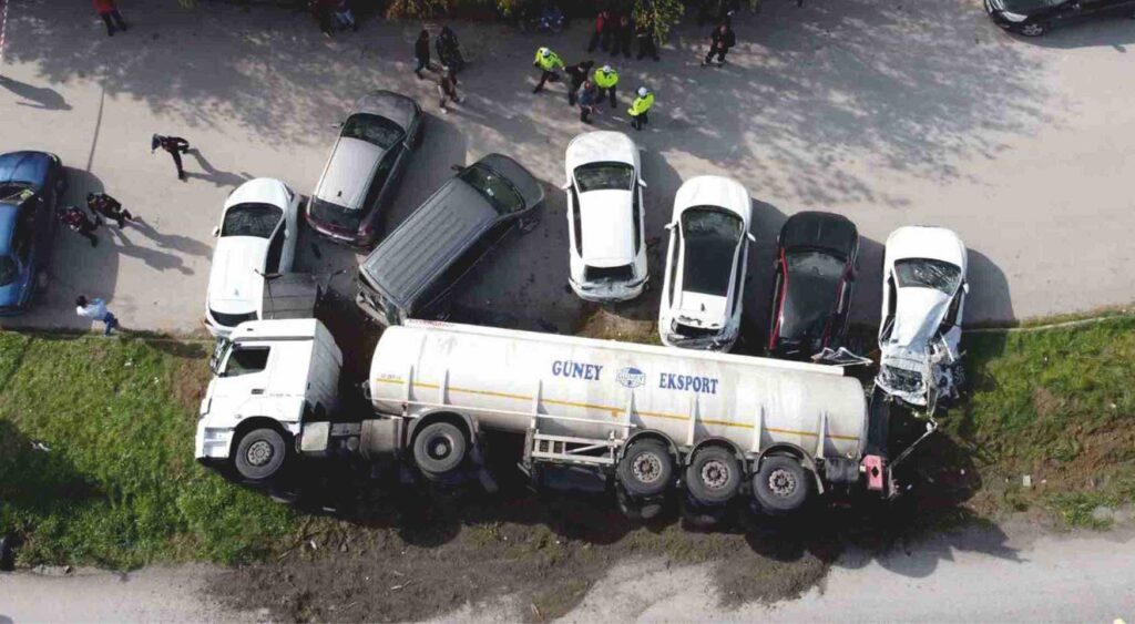 Olay, Balıkesir’de Değirmenbogazi piknik alanının önünde meydana geldi. Bursa yönünden Balıkesir istikametinde gelen M.G. yönetimindeki 63 AIM 790 plakalı ayçiçek yağı yüklü tanker, direksiyon hakimiyetinin kaybedilmesi sonucu park halindeki otomobillerin üzerine devrildi. Tankerde bulunan 2 kişinin yara almadan tankerden çıktığı öğrenildi. Kaza ihbarı üzerine olay mahalline itfaiye, sağlık ve polis ekipleri sevk edildi. Yağ dolu tankerde bir sızıntı olmadığı görüldü. Karesi ekipleri tarafından olay yerinde yangına karşı gerekli güvenlik önlemi alındı. Kazayla ilgili tahkikatın devam ettiği açıklandı. İHA
