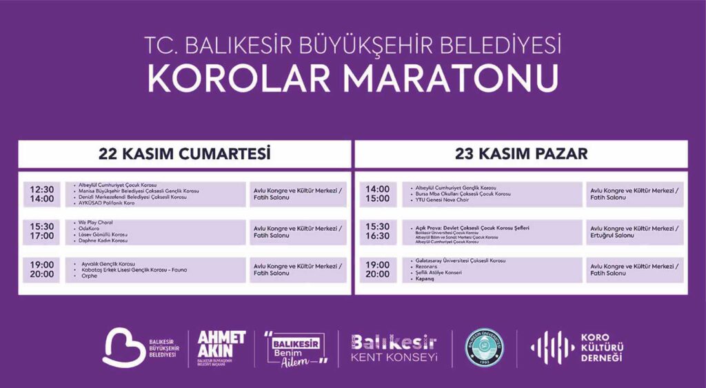 Koro Kültürü Derneği uluslararası alanlarda Türkiye’de koro müziğine yönelik farkındalık çalışmalarıyla da öne çıkıyor. Tüm etkinliklerin halka açık olması, bu maratonu Balıkesir’in kültür hayatında herkesin katılabileceği özel bir deneyime dönüştürecek. Her yaştan vatandaşın katılım sağlayabileceği bu müzik şölenine ilginin yoğun olması bekleniyor.