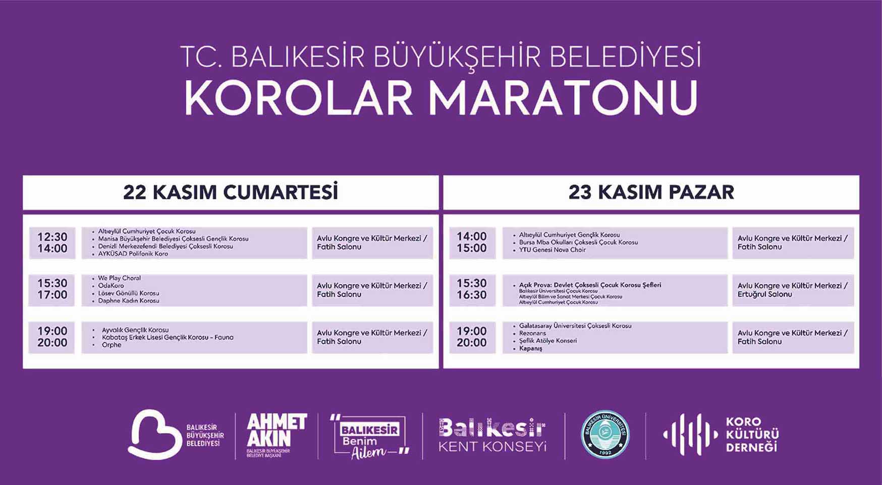 Etkinlik ülkemizin farklı şehirlerinden gelen çok sayıda korist ile müziğe gönül veren herkesi aynı çatı altında bir araya getirmeyi hedefliyor. Balıkesir kültür ve sanat yaşantısında geniş katılımlı ilk korolar buluşması olacak olan Korolar Maratonu ile bir ilki gerçekleştirecek. Festivaller şehri olma yolunda hızlı adımlarla ilerleyen Balıkesir, koro müziğinin festival havasında yaşanacağı bu maratonla ülkemizde 2025 yılında koro müziğine ev sahipliği yapmış olacak.
