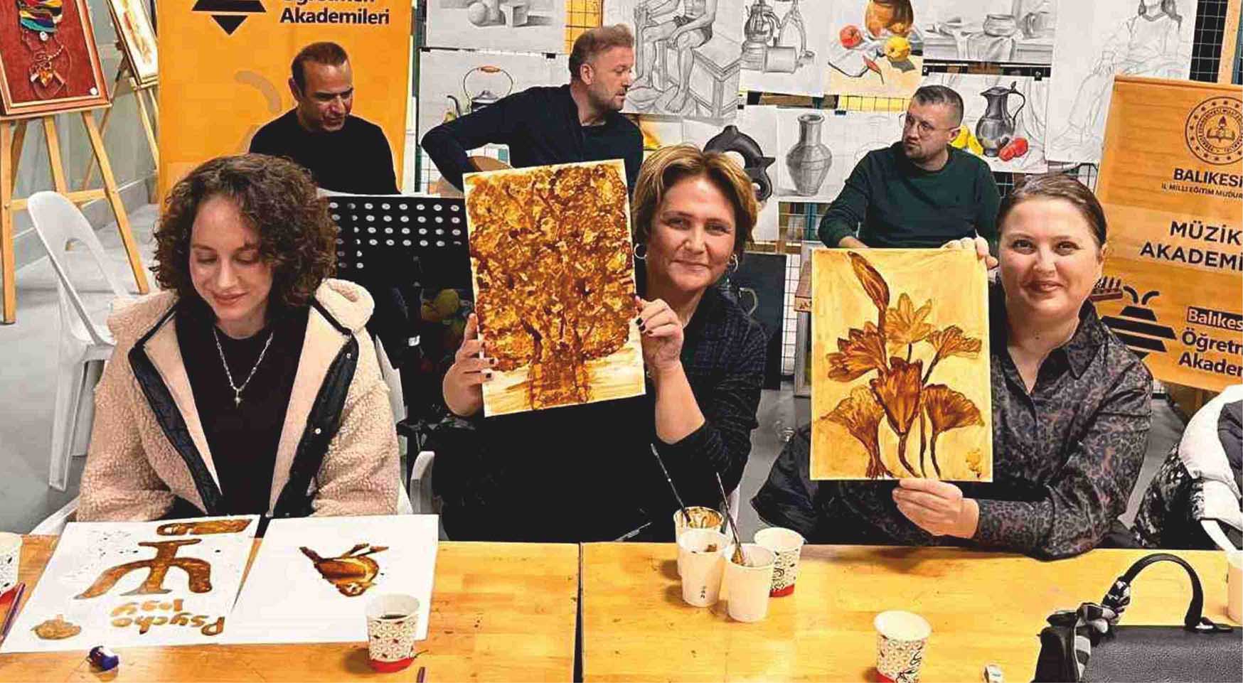 “Kahvenin Rengi, Müziğin Sesi” başlığıyla BM 75. Yıl Gençlik Merkezi’nde gerçekleştirilen faaliyette öğretmenler sanat dolu bir gün geçirdi. BM 75. Yıl Gençlik Merkezi Görsel Sanatlar Atölyesinde gerçekleştirilen faaliyette öğretmenler müziğin ilham verici gücü eşliğinde kahve ile boyama tekniğini kullanarak görsel çalışmalar hazırladı. Müzik Akademisi Koordinatörü Evrim Tan’ın rehberliğinde gerçekleştirilen faaliyette kahvenin boyamada kullanımı, kullanımına yönelik teknikler, geçmişten günümüze bu tekniğin kullanıldığı alanlar ve bu teknik ile oluşturulmuş görsel örnekler Evrim Tan tarafından öğretmenler ile paylaşıldı. Kanun Sanatçısı Anıl İbrahim Yıldırım ve Bilgisayar Mühendisi ve Gitarist Taylan Sezer’in de enstrümanlarıyla hazır bulunduğu faaliyette canlı müzik eşliğinde öğretmenler görsel çalışmalarını oluşturmaya başladı. Önce kara kalemle başlayan çizimler kahve tonlarıyla renklenmeye başladı. Çalınan ve söylenen şarkılara da ara ara eşlik eden öğretmenler keyifli dakikalar yaşadı. Oluşturulan çalışmaların incelenmesi ve sunulmasının ardından fotoğraf çekimi ile faaliyet sonlandırıldı.