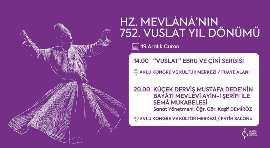 Balıkesir Büyükşehir Belediyesi tarafından Hz. Mevlana’nın 752. Vuslat yıl dönümü nedeniyle 19 Aralık Cuma günü “Vuslat” Ebru ve Çini Sergisi ile “Derviş Mustafa Dede’nin Bayâti Mevlevî Ayin-i Şerîf’i ile Semâ Mukabelesi” etkinlikleri gerçekleştirilecek.
