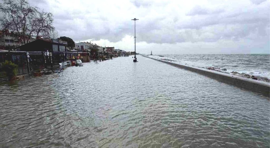 Edremit ilçesinde etkili olan şiddetli lodos fırtınası hayatı felç etti. Saatteki hızı 90 kilometreye ulaşan fırtına sebebiyle deniz taştı, turistik işletmeler sular altında kaldı. Kara ile denizin birleşmesi sonrası ekipler alarma geçti.