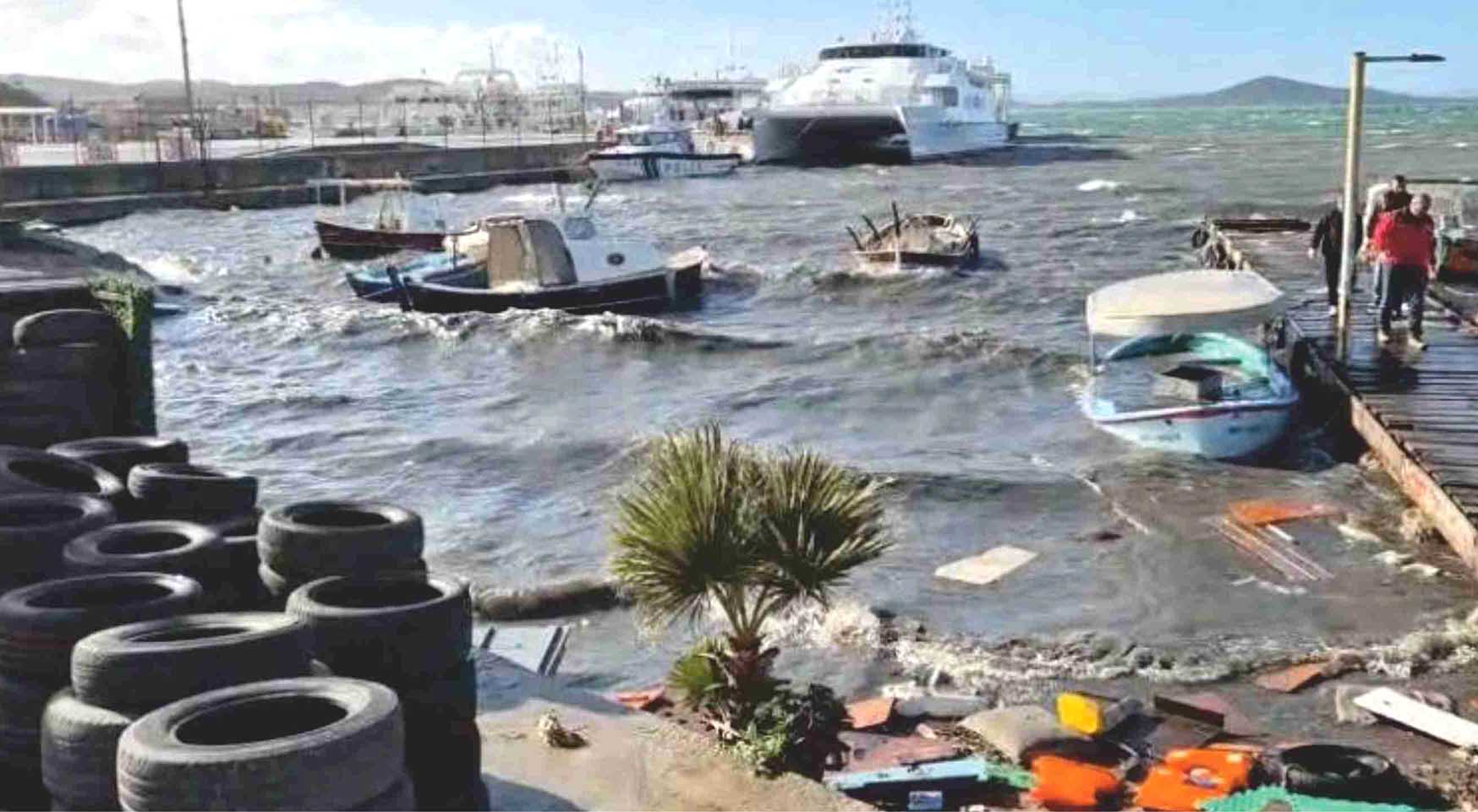 Ayvalık ilçesinde şiddetli lodos hayatı denizdeki tekneleri parçaladı..
