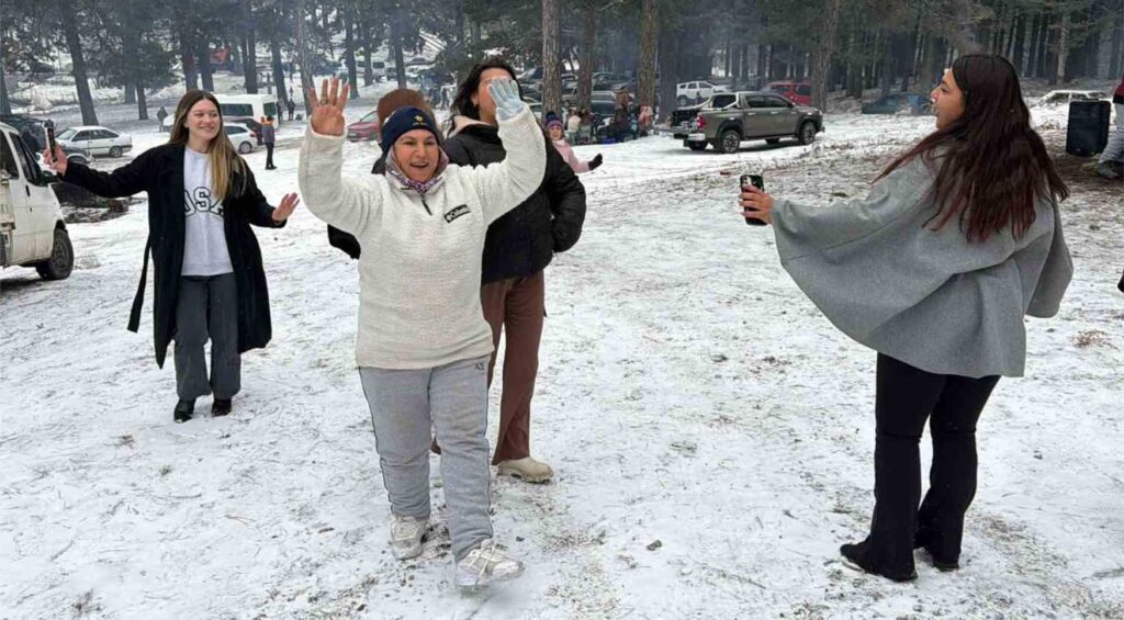 Kazdağları’nın Hanlar mevkiine yağan kar, pazar tatili ve sömestir tatiliyle birleşince uzun süredir şehir merkezinde kar yağışı görmeyen Edremitliler, karın tadını göbek atarak çıkarttılar.