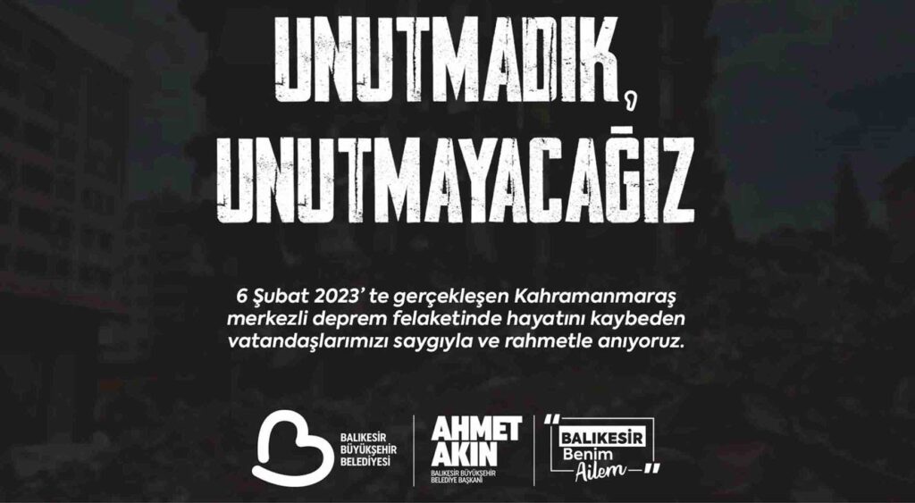 On binlerce yurttaşın can verdiği asrın felaketi olarak nitelendirilen 6 Şubat 2023 depremlerinde hayatını kaybedenleri anan Balıkesir Büyükşehir Belediye Başkanı Ahmet Akın “Depremlerde yaşamını yitiren tüm vatandaşlarımıza Allah’tan rahmet, ailelerine ve milletimize bir kez daha sabır diliyorum. Acımız büyük, ancak bu acıyı unutmadan, dersler çıkararak daha güvenli bir gelecek inşa etmek hepimizin ortak görevidir.” dedi.