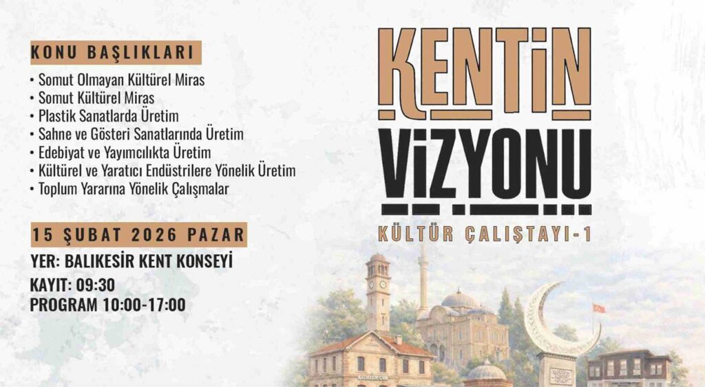 Balıkesir Büyükşehir Belediyesi ile Balıkesir Kent Konseyi iş birliğinde şehrin kültür ve sanat vizyonunu şekillendirmek amacıyla üç aşamada hayata geçirilecek olan “Kentin Vizyonu- Kültür Çalıştayı”nın ilki 15 Şubat 2026 Pazar günü Balıkesir Kent Konseyi binasında gerçekleştirilecek.