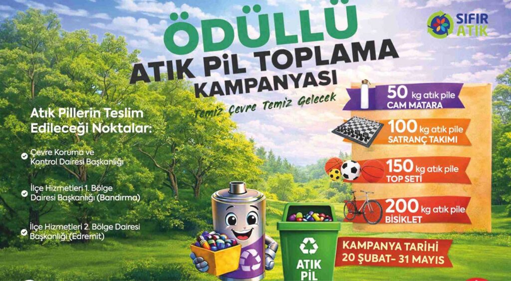 “Sıfır Atık Projesi” kapsamında hayata geçirilen kampanyada, atık piller Çevre Koruma ve Kontrol Dairesi Başkanlığı, İlçe Hizmetleri 1. Bölge Dairesi Başkanlığı (Bandırma) ve İlçe Hizmetleri 2. Bölge Dairesi Başkanlığı (Edremit) olmak üzere üç noktaya teslim edilebilecek. Teslim edilen atık pillerin karşılığında atık pilleri teslim eden kişilere çeşitli hediyeler takdim edilecek. 50 kilogram atık pil getirilmesi karşılığında cam matara, 100 kilogram atık pil getirilmesi karşılığında satranç takımı, 150 kilogram atık pil getirilmesi karşılığında top seti, 200 kilogram atık pil getirilmesi karşılığında ise bisiklet hediye edilecek. Atık Pil Toplama Kampanyasına son katılım tarihi 31 Mayıs 2026 Pazar günü olacak. Kampanyanın ödül töreni ise 5 Haziran Çevre Haftası Etkinlikleri kapsamında gerçekleştirilecek.