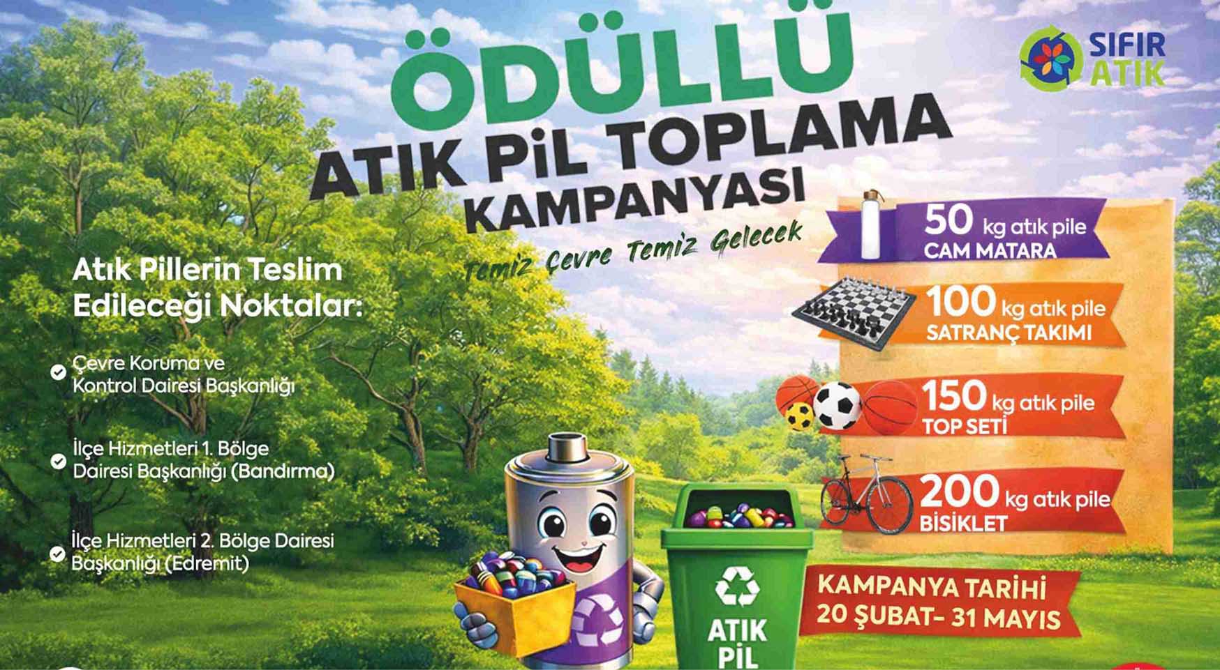 “Sıfır Atık Projesi” kapsamında hayata geçirilen kampanyada, atık piller Çevre Koruma ve Kontrol Dairesi Başkanlığı, İlçe Hizmetleri 1. Bölge Dairesi Başkanlığı (Bandırma) ve İlçe Hizmetleri 2. Bölge Dairesi Başkanlığı (Edremit) olmak üzere üç noktaya teslim edilebilecek. Teslim edilen atık pillerin karşılığında atık pilleri teslim eden kişilere çeşitli hediyeler takdim edilecek. 50 kilogram atık pil getirilmesi karşılığında cam matara, 100 kilogram atık pil getirilmesi karşılığında satranç takımı, 150 kilogram atık pil getirilmesi karşılığında top seti, 200 kilogram atık pil getirilmesi karşılığında ise bisiklet hediye edilecek. Atık Pil Toplama Kampanyasına son katılım tarihi 31 Mayıs 2026 Pazar günü olacak. Kampanyanın ödül töreni ise 5 Haziran Çevre Haftası Etkinlikleri kapsamında gerçekleştirilecek.