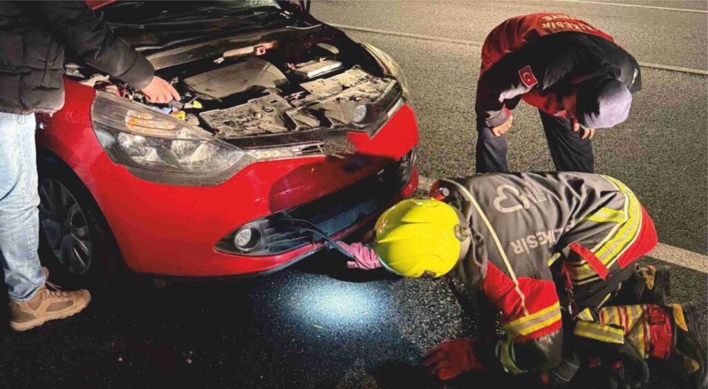 Gönen ilçesinde bir aracın motor kısmına giren tilki, ekiplerin yaklaşık yarım saat süren titiz çalışması sonucu bulunduğu yerden sağ olarak çıkarılırken, yaşanan olay çevrede kısa süreli şaşkınlığa neden oldu.