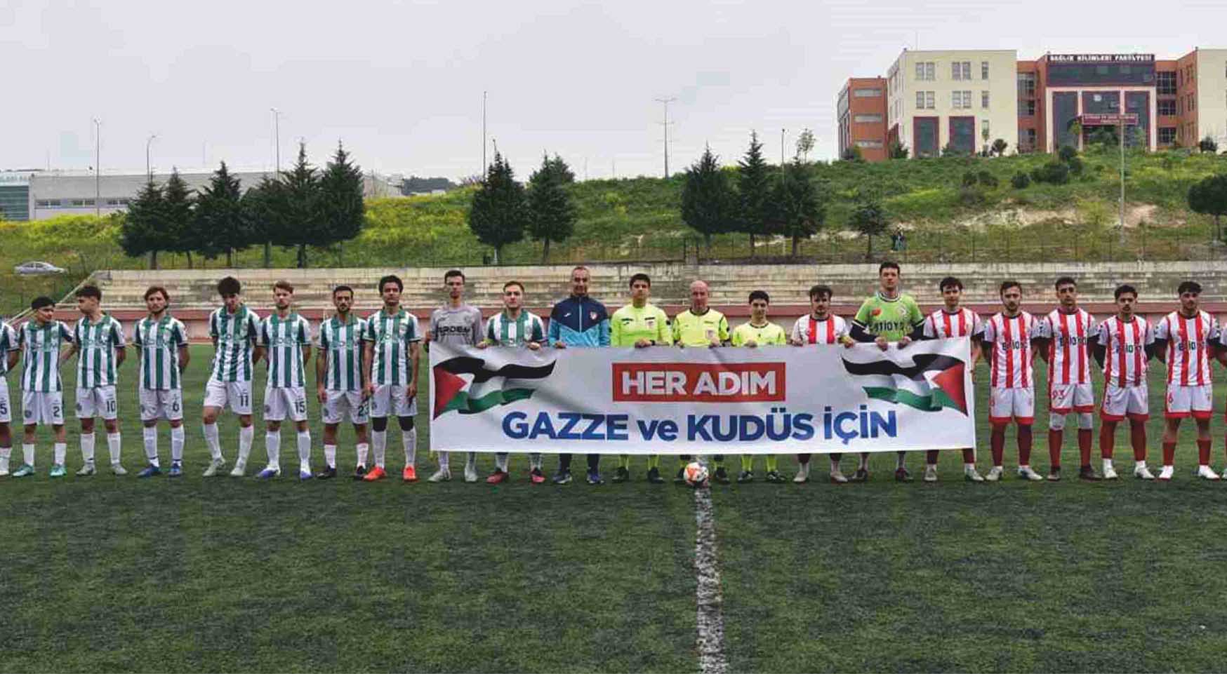 Alparslan Türkeş Stadyumu’nda oynanacak futbol karşılaşması öncesinde öğrenciler, sahaya mesaj içeren tişörtlerle çıkarak “Her Adım Gazze ve Kudüs İçin” yazılı pankart açtı ve Filistin’de yaşanan gelişmelere dikkat çekti. İHA