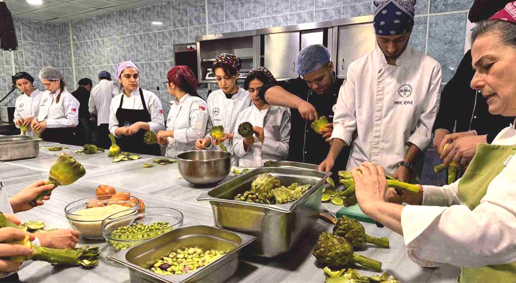 Uygulamalı Bilimler Fakültesi Mutfağındaki etkinlikte, gastronomide sürdürülebilirlik yaklaşımının önemli bir parçası olan yerel ve nitelikli ürün kullanımına dikkat çekilerek öğrencilerin bu bilinçle değerlendirme yapmaları hedeflendi. İlk aşamada öğrenciler, farklı coğrafyalarda yetiştirilen üç ayrı zeytinyağını tanıma ve değerlendirme fırsatı buldu. Ayvalık, Yamalak Sarısı ve Trilye zeytinlerinden elde edilen zeytinyağlarının aroma, koku ve tat özellikleri karşılaştırmalı olarak incelendi. Tadım sürecinin ardından öğrenciler üç gruba ayrılarak uygulama aşamasına geçti. Her grup, farklı zeytinyağları kullanarak enginar dolması hazırladı. Uygulama boyunca öğrenciler, kullanılan zeytinyağlarının yemeğe kattığı aroma, lezzet ve karakter farklılıklarını birebir deneyimleme fırsatı bulurken, aynı yemeğin farklı ürünlerle nasıl değişebildiğini gözlemledi. Bu süreç, uygulamalı öğrenme deneyimini zenginleştirerek mesleki becerilerinin gelişimine katkı sundu. Fakülte Dekanı Prof. Dr. M. Oğuzhan İlban, etkinliğe ilişkin yaptığı değerlendirmede, zeytinyağının gastronomide temel ve belirleyici bir unsur olduğunu vurgulayarak, farklı yörelere ait zeytinyağlarının tanınmasının öğrenciler açısından önemli bir kazanım olduğunu ifade etti. İlban, sürdürülebilir gastronomi bilincinin bu tür uygulamalarla güçlendiğini belirterek, öğrencilerin çevreye duyarlı yaklaşımı deneyimlemesinin önemine dikkat çekti. Gerçekleştirilen tadım ve uygulama sürecinin, öğrencilerin ürünler arasındaki tat ve aroma farklarını ayırt edebilme becerilerini geliştirdiğini ve mesleki yetkinliğe doğrudan katkı sağladığını dile getirdi. Etkinlik sonunda Fakülte Dekanı Prof. Dr. M. Oğuzhan İlban, değerli paylaşımları ve eğitime sunduğu katkılardan dolayı Şef Aylin Yazıcıoğlu’na teşekkür belgesi takdim etti. Gerçekleştirilen etkinlik, öğrencilerin zeytinyağına ilişkin duyusal analiz becerileri ile ürün bilgisini geliştirdiği ve uygulamalı mutfak deneyimi kazandığı verimli bir eğitim olarak tamamlandı. İHA