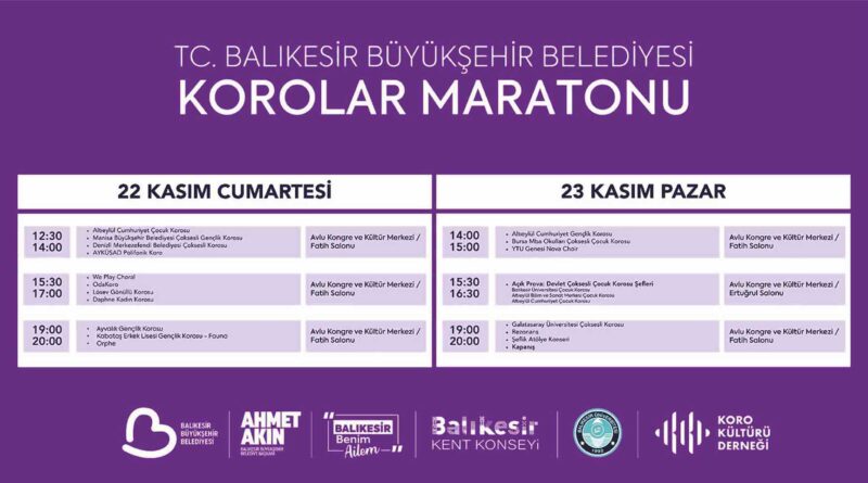 Read MoreBalıkesir Büyükşehir Belediyesi, Koro Kültürü Derneği tarafından 22–23 Kasım günlerinde Balıkesir Avlu Yaşam Merkezi’nde Korolar Maratonu ile